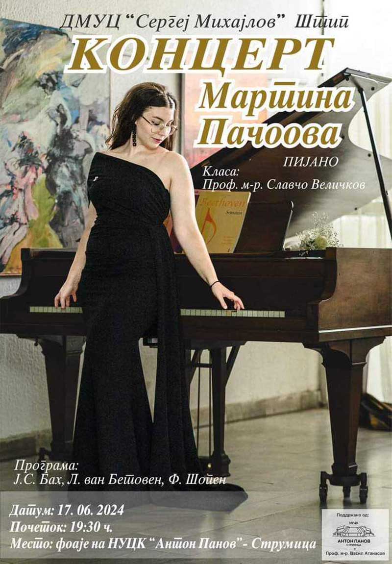 Во понеделник, 17 јуни од 19:30 часот во Центарот за култура „Антон Панов“ во Струмица ќе се одржи Концерт на пијано во изведба на струмичанката Мартина Пачоова. Таа ќе изведе дела од Бах, Бетовен, Шопен…