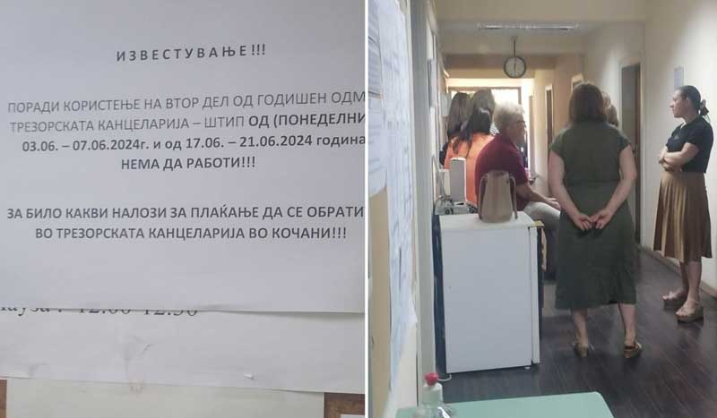 Трезорската канцеларија во Штип извести дека поради вториот дел од годишниот одмор на единствениот вработен, таа нема да работи до 21 јуни и дека за какви било налози за плаќање треба да се оди во канцеларијата во Кочани, Кавадарци или Велес. Во некои градови каде што има трезорски канцеларии со повеќе вработени проблем било што имале само еден компјутер.