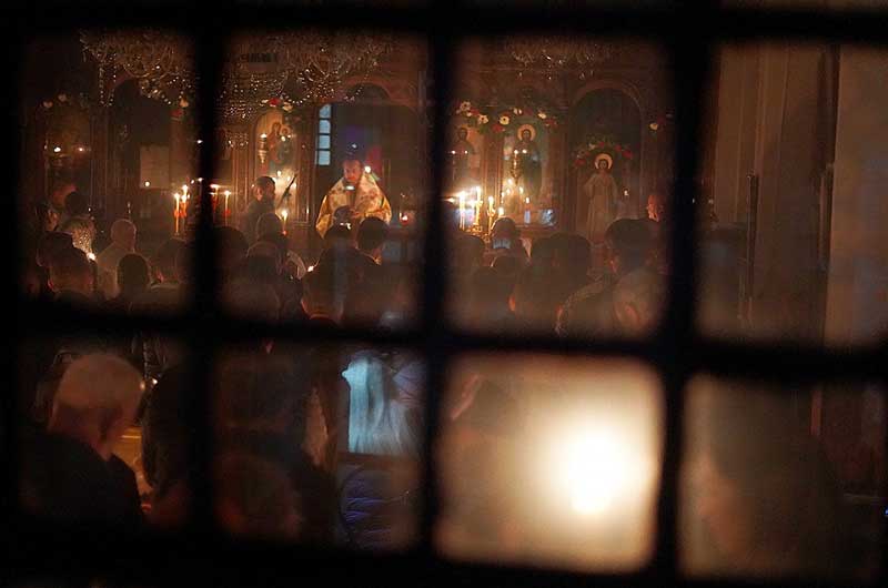 На полноќ сите присутни со тропарот „Христос воскресе“ три пати ја обиколуваат црквата. Во црквата се останува за големата литургија, а потоа се причестуваат, се кршкаат со црвените јајца и се омрсуваат. На малите деца во саботата навечер под перницата им ставаат црвено јајце што им го даваат утрото во неделата кога ги водат во црквата.