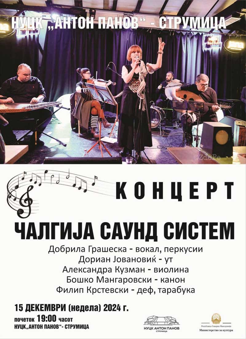 Во недела, 15 декември во Центарот за култура „Антон Панов“ во Струмица, со почеток во 19:00 часот свој концерт ќе одржат членовите на популарниот музички состав „Чалгија саунд систем“.