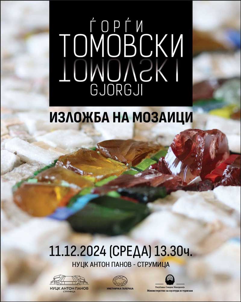 Во Центарот за култура „Антон Панов“ во Струмица на патрониот празник на градот Струмица – 11 декември, во 13:30 часот ќе биде отворена Изложба на мозаици од авторот Ѓорѓи Томовски.