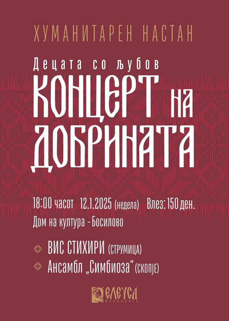 Фондацијата „Елеуса“ на 12 јануари (недела) во 18:00 часот во Домот на културата во Босилово ќе организира Хуманитарен концерт на добрината со Вокално инструменталниот состав „Стихири“ од Струмица и Ансамблот „Симбиоза“ од Скопје.