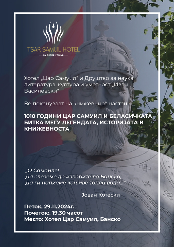 Во организација на хотел „Цар Самуил“ и Друштво за наука, литература, култура и уметност „Иван Василевски“, во петок (29 ноември) со почеток во 19:30 часот во хотелот „Цар Самуил“ во Банско ќе се одржи книжевен настан „1010 години Цар Самул и Беласичката битка меѓу легендата, историјата и книжевноста“.