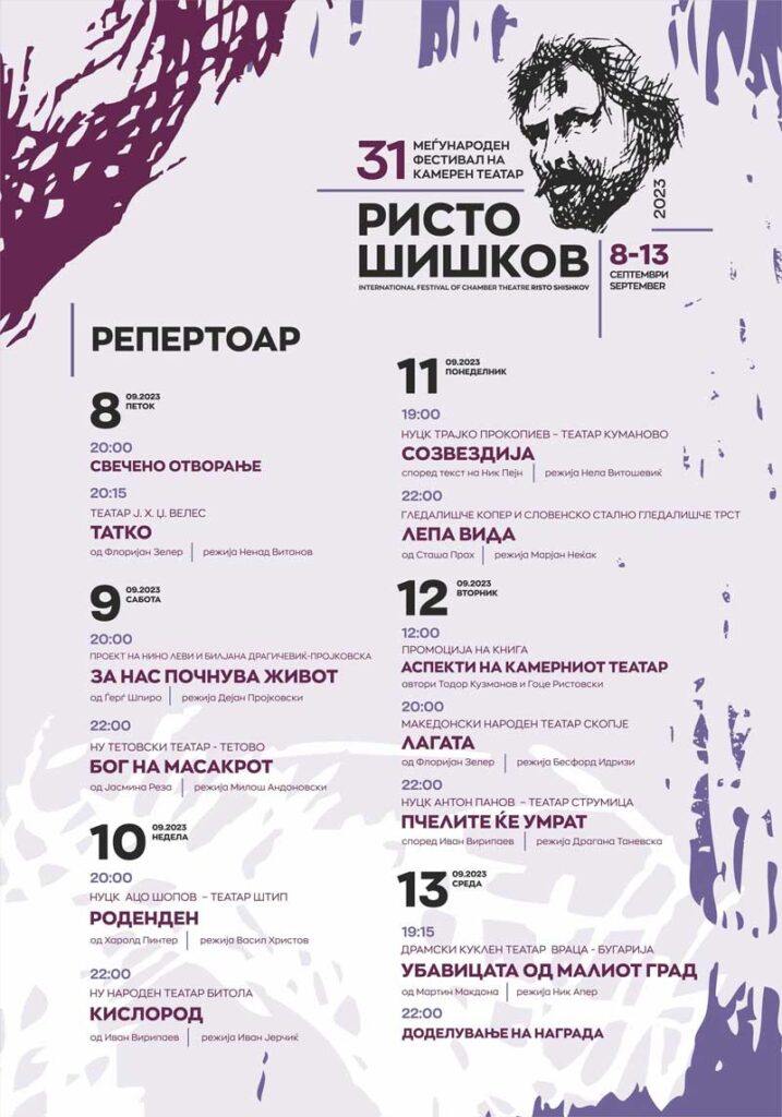 И годинава, традиционално на Денот на независноста на Македонија, 8-ми септември стартува уште едно издание на Меѓународниот фестивал на камерен театар „Ристо Шишков“, годинава по 31-ви пат. Фестивалот ќе се одржува до 13-ти септември на сцените во Центарот за култура „Антон Панов“ во Струмица.