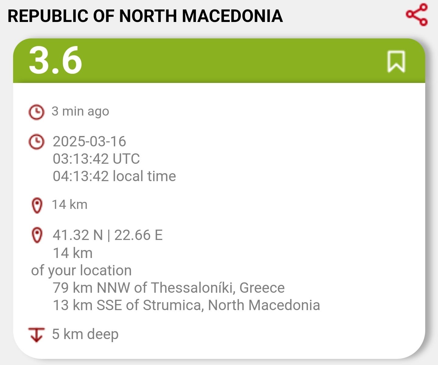 Утрово во 04:13 часот земјотрес со јачина од 3.6 степени е почуствуван во струмичко-валандовскиот регион. Епицентарот бил на 13 километри од Струмица.