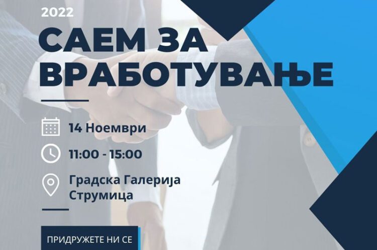 Утре (понеделник, 14 Ноември) од 11:00 до 15:00 часот во Градската уметничка галерија на плоштадот во Струмица ќе се одржи „Саем за вработување“ на кои 30 компании ќе понудат работни места, а граѓаните кои барат работа ќе можат да го достават своето CV и да прашат на лице место кои работни позиции и можности се нудат.