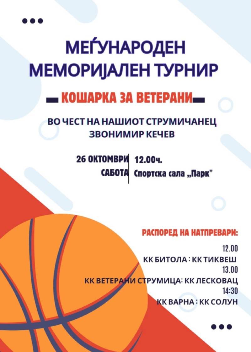 Утре (сабота, 26 октомври), во Спортската сала „Парк“ во Струмица во организација на КК „ВЕТЕРАНИ БАСКЕТ“ Струмица за прв пат ќе се одржи Меѓународен Меморијален турнир во кошарка за ветерани, а во чест на прерано починатиот кошаркар Звонимир Кечев – Кечето, некогашен член на струмичките кошаркарски великани КК „Неметали Огражден“ и КК „Македонија ‘91“.