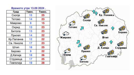 Утре (петок, 13 септември) времето ќе биде променливо облачно и нестабилно со локален пороен дожд и грмежи. Наместа во западните и источните делови ќе има појава на невреме со интензивен пороен дожд (над 20 л/м2), грмежи и силен ветер (над 70 км/ч). Во деновите потоа ќе се задржи променливо облачно време со повремен локален дожд.