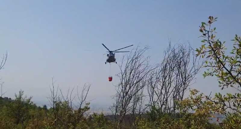 „Бидејќи се работи за тешко пристапен терен, еден полициски хеликоптер префрли 10 струмички пожарникари во близина на пожарот за да можат да започнат со гаснење од земја, додека полицискиот хеликоптер ќе дејствува од воздух“, објави Ангелов.