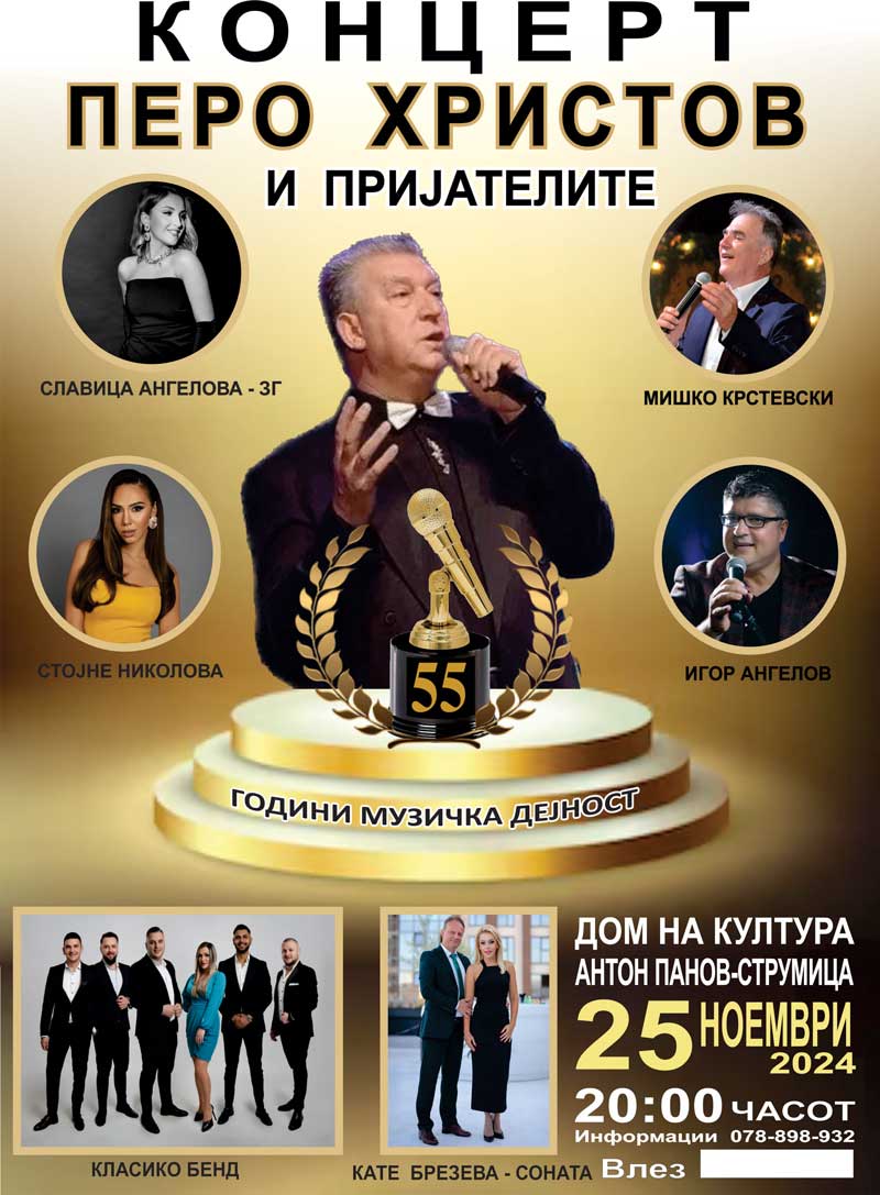 Легендата на македонската песна и еден од најдобрите фолк пејачи во Македонија, Перо Христов годинава одбележува 55 години на музичката сцена. И овој голем јубилеј со концерт во својата родна Струмица. Концертот е закажан на 25 ноември (понеделник) на големата сцена во Центарот за култура „Антон Панов“ со почеток во 20:00 часот.