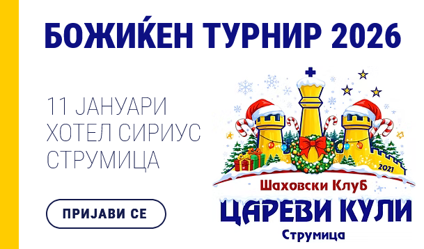 Шаховскиот клуб „Цареви Кули“ од Струмица организира Божиќен шаховски турнир кој ќе се одржи на 11 јануари 2026-та во Хотел „Сириус“.