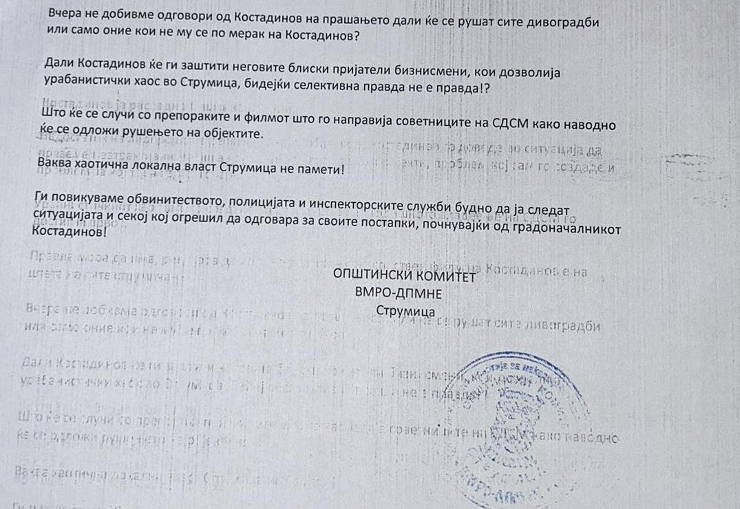 Ги повикуваме обвинитеството, полицијата и инспекторските служби бурно да ја следат ситуацијата и секој кој се огрешил да одговара за своите постапки, почнувајќи од градоначалникот Костадинов“ – напишаа од ВМРО-ДПМНЕ Струмица.