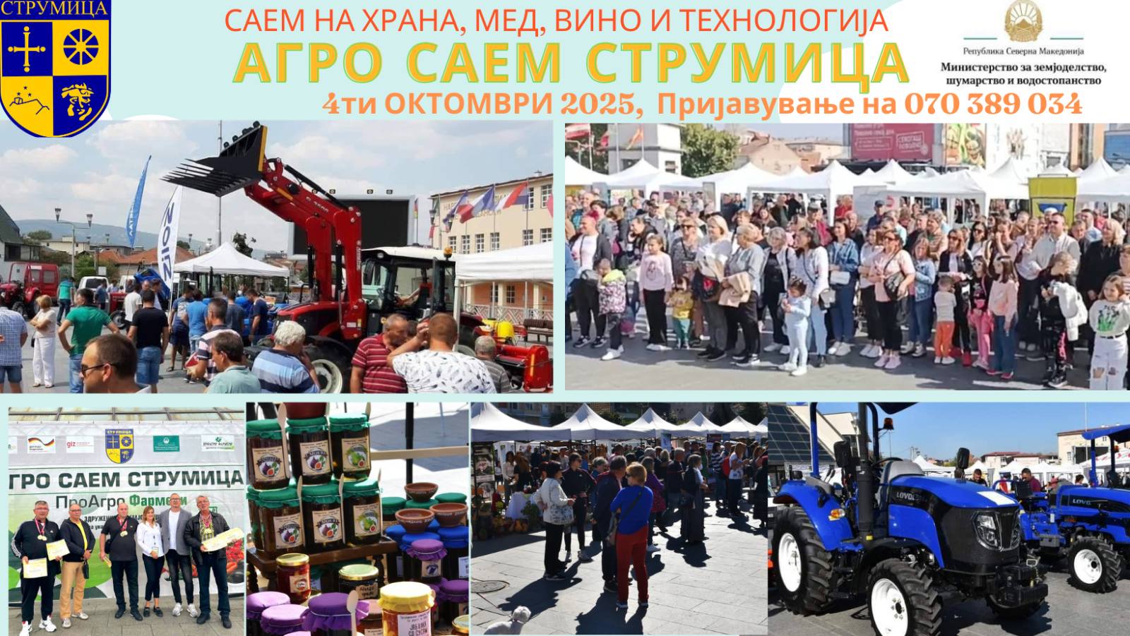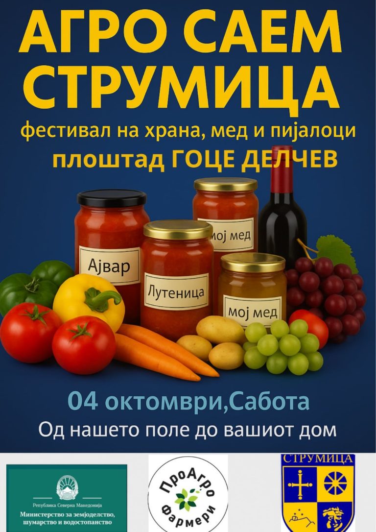 Во организација на Здружението Проагро Фармери во сабота, 4-ти октомври со почеток од 09:00 часот, на плоштадот „Гоце Делчев“ во струмица по петти пат ќе се одржи „АГРО САЕМ СТРУМИЦА 2025“ – најголемиот фестивал на храна, мед и пијалоци.