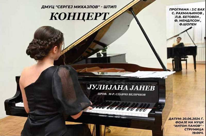 Во четврток, 20 јуни од 19:00 часот во фоајето на Центарот за култура „Антон Панов“ во Струмица, свој солистички концерт ќе одржи младата пијанистка Јулијана Јанев од Струмица, ученичка во ДМУЦ „Сергеј Михајлов” во Штип, во класата на проф. м-р Славчо Величков. Таа ќе свири дела од Јохан Себастијан Бах, Сергеј Рахмањинов, Лудвиг Ван Бетовен, Феликс Менделсон, Фредерик Шопен.