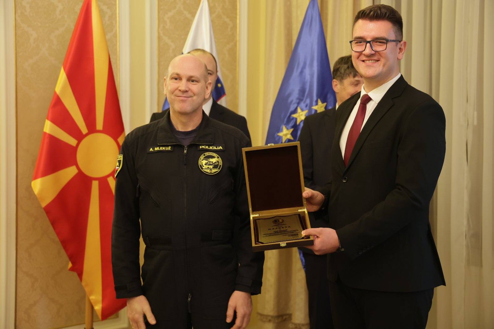 Во резиденцијата на Владата на Република Словенија, Вила Подрожник во Љубљана, на свечен настан во присуство на министерот за одбрана на Македонија, Владо Мисајловски и министерот за одбрана на Словенија, Борут Сајовиц, градоначалникот општина Ново Село, Ѓорѓе Божинов додели плакети на армиските пилоти, полициските пилоти и пожарникарите кои на 17 јули минатата година го спасија неговиот живот и животите на тројца пожарникари и тројца цивили за време на пожарите на планината Огражден кај Бадилен, информираат од општината.