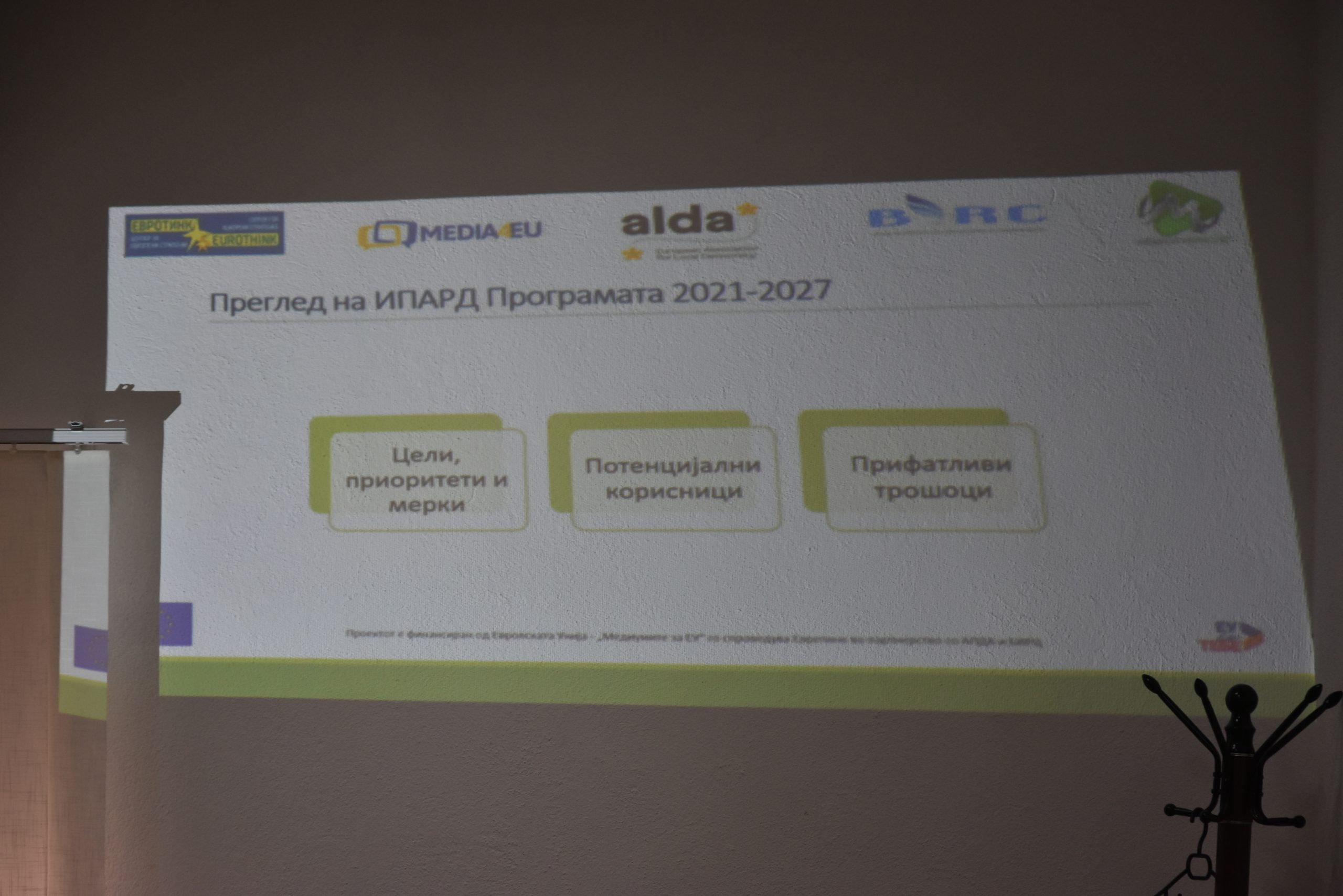На присутните им се обрати консултантот Тихомир Петрески кој им ја објасни ИПАРД програмата на ЕУ. Конкретно се задржа на неколку точки во однос на тоа како може да се аплицира, за што конкретно, како тече постапката, кои трошоци се прифатливи односно сите можни чекори до Европските фондови за земјоделство и рурален развој. Тој подвлече дека програмата нуди огромни средства кои може да се слеат во македонскиот аграр и реален сектор, но се потребни издржани проекти кои даваат можност за одржливо производство.