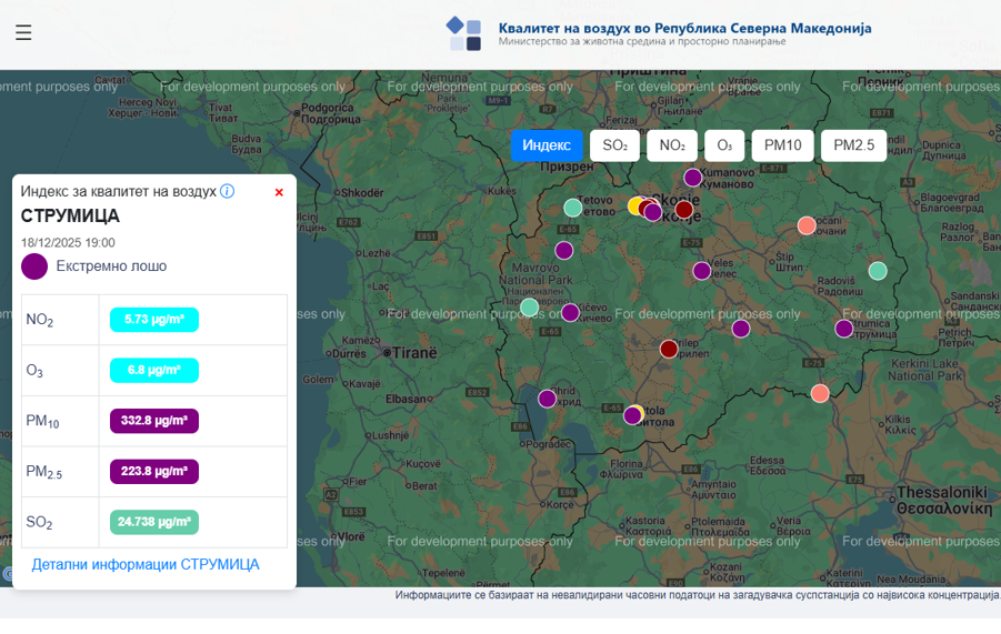 Според податоците од државниот автоматски мониторинг систем, вечерва во 19:00 часот, мерната станица во Струмица регистрираше алармантно високи концентрации на загадувачки честички: PM10 – 332,8 μg/m³ и PM2.5 – 223,8 μg/m³, што е повеќекратно над дозволените гранични вредности и претставува сериозен ризик по здравјето на граѓаните. Индексот за квалитет на воздухот е оценет како „екстремно лош“.