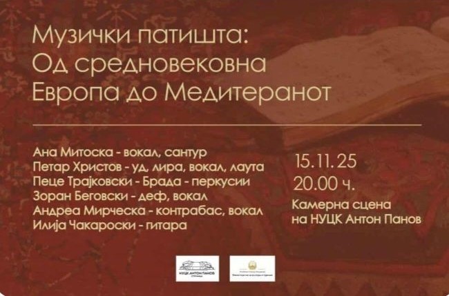Во сабота, 15 ноември, со почеток во 20:00 часот, на Камерната сцена при Центарот за култура „Антон Панов“ во Струмица, ќе се одржи концертот со наслов „Музички патишта: Од средновековна Европа до Медитеранот“.
