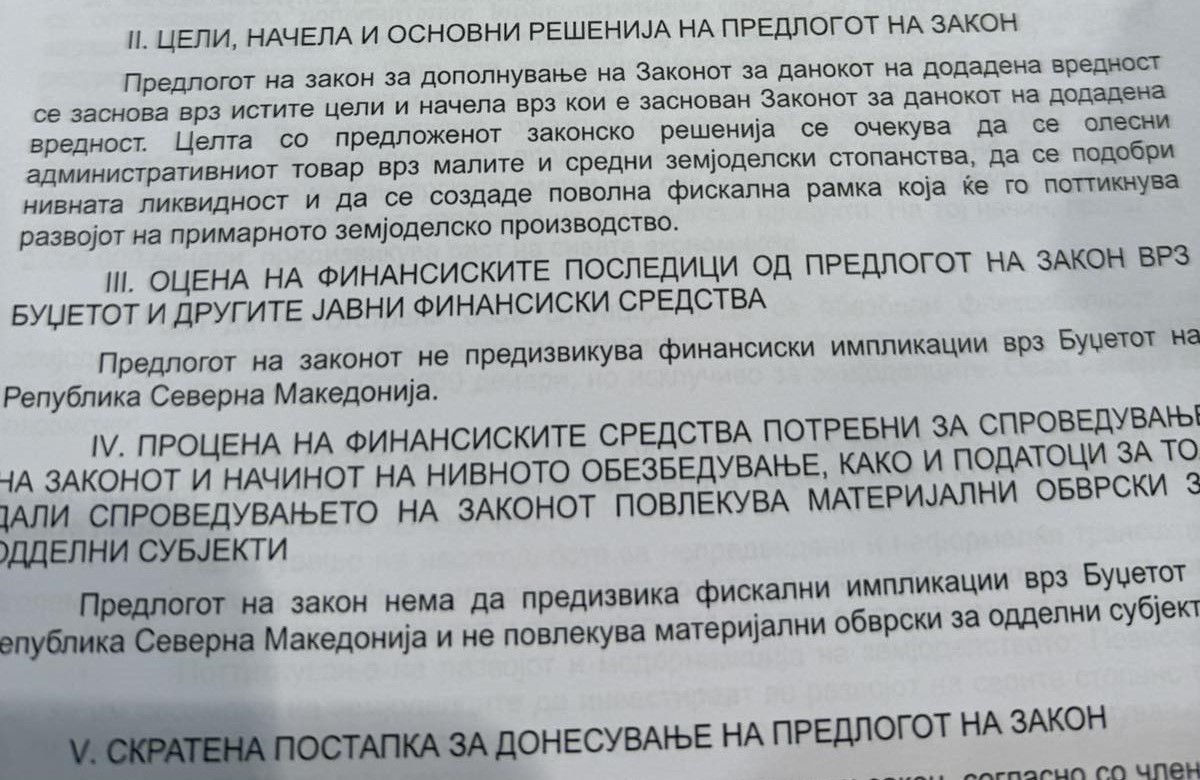 Предлогот на закон за дополнување на Законот за данокот на додадена вредност се заснова врз истите цели и начела врз кои е заснован Законот за данокот на додадена вредност. Целта со предложеното законско решенија се очекува да се олесни административниот товар врз малите и средни земјоделски стопанства, да се подобри нивната ликвидност и да се создаде поволна фискална рамка која ќе го поттикнува развојот на примарното земјоделско производство.