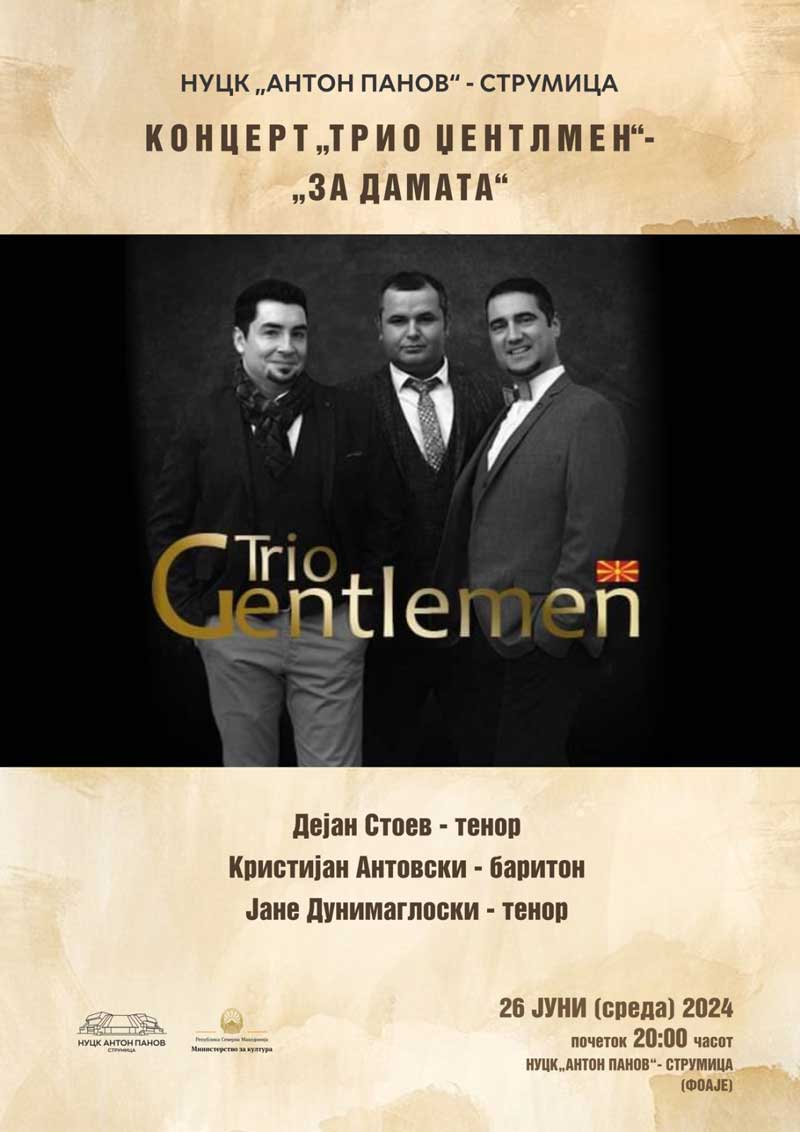Центарот за култура „Антон Панов“ во Струмица на 26 јуни (среда) од 20:00 часот во фоајето на центарот организира Концерт со „Трио Џентлмен“ насловен „За дамата“.