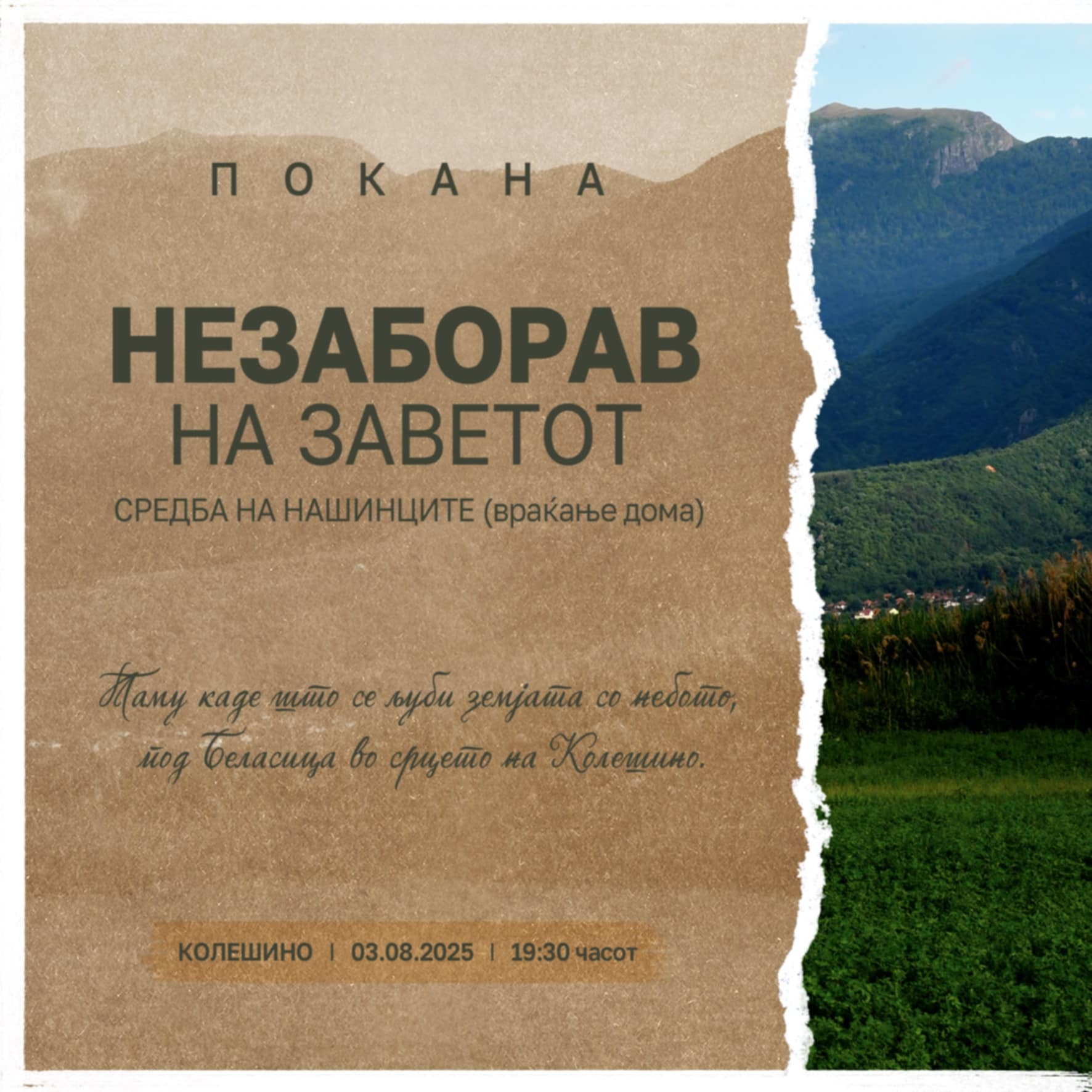 Во недела на 3-ти Август во селото Колешино, општина Ново Село со почеток во 19:30 часот ќе се одржи културно-забавен настан насловен „Незаборав на заветот“ – Средба на нашинците (враќање дома).