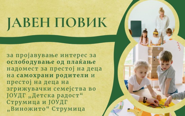 Општина Струмица објави јавен повик за пројавување интерес за ослободување од плаќање надомест за престој на деца на самохрани родители и деца сместени во згрижувачки семејства во ЈОУДГ „Детска радост“ и „Виножито“.
