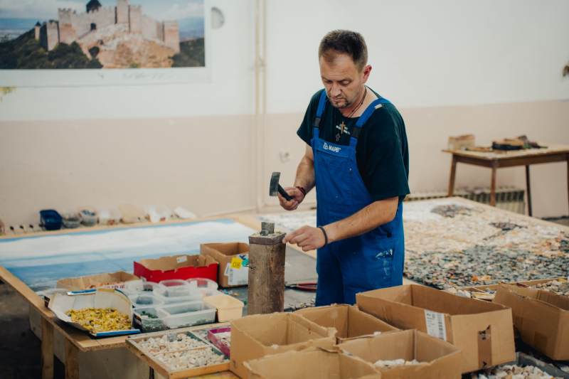 „Бидејќи мозаикот е една од најделикатната техника, бара многу подготовки, кршење на камења, мермери, а во оваа дело користен е и венецијан стакло кој го набавувам од Италија. До Нова година ќе биде поставен првиот дел – Царевите кули и грбот на Струмица, а потоа продолжувам со другите делови. Сакам да оставам големо дело на градот Струмица“ – со гордост ни кажа Филев.