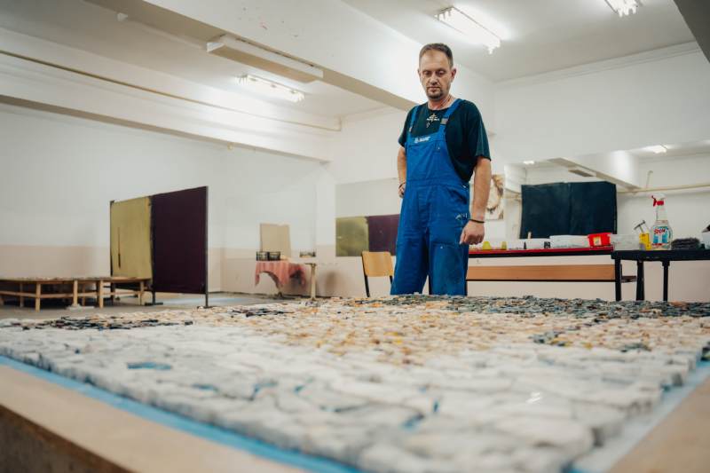 „Бидејќи мозаикот е една од најделикатната техника, бара многу подготовки, кршење на камења, мермери, а во оваа дело користен е и венецијан стакло кој го набавувам од Италија. До Нова година ќе биде поставен првиот дел – Царевите кули и грбот на Струмица, а потоа продолжувам со другите делови. Сакам да оставам големо дело на градот Струмица“ – со гордост ни кажа Филев.