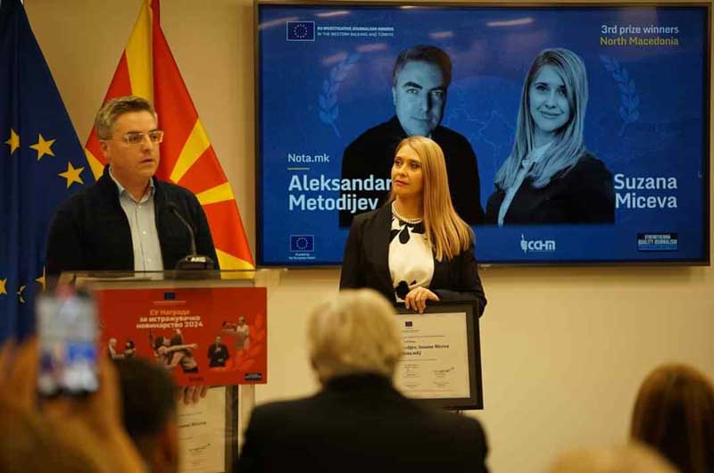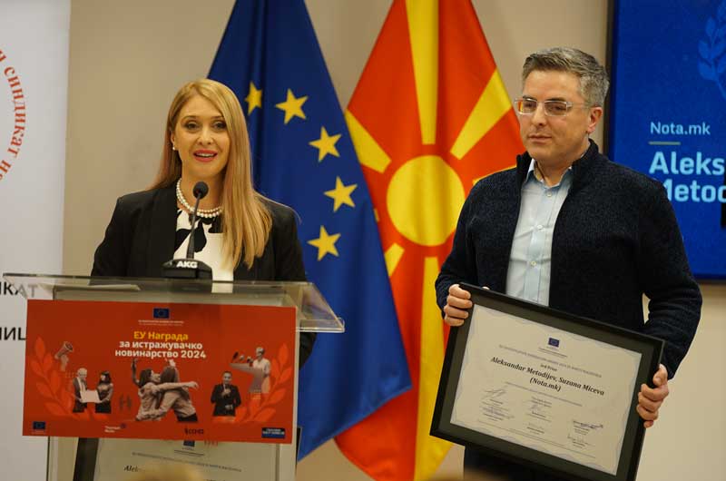 Церемонијата за доделување на Наградите на Европската Унија за истражувачко новинарство 2024-та, се одржа вечерва во Скопје, а на која беа објавени најдобрите стории во Северна Македонија. Престижната награда поддржана од Европската Унија ги препознава најдобрите истражувачки стории објавени во претходната година во земјите од Западен Балкан и во Турција.