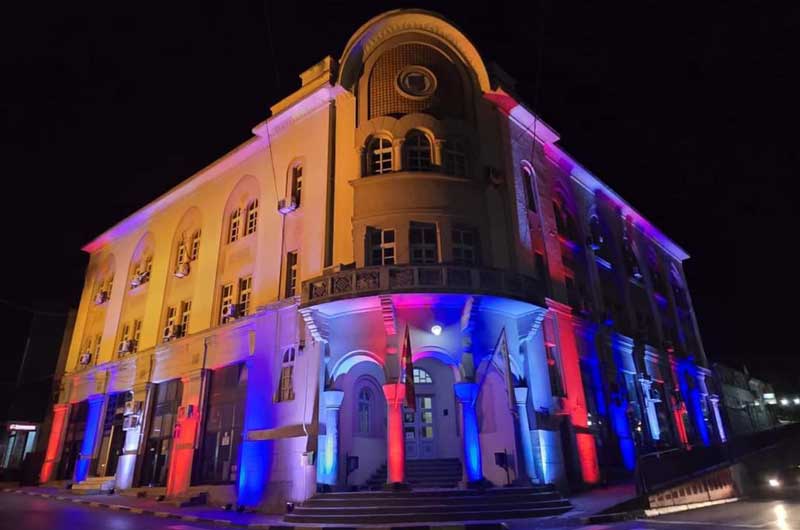 Зградата на Општина Струмица осветлена во боите на знамето на Република Србија во знак на сочувство до семејствата на загинатите во големата трагедија која се случи вчера во Нови Сад.
