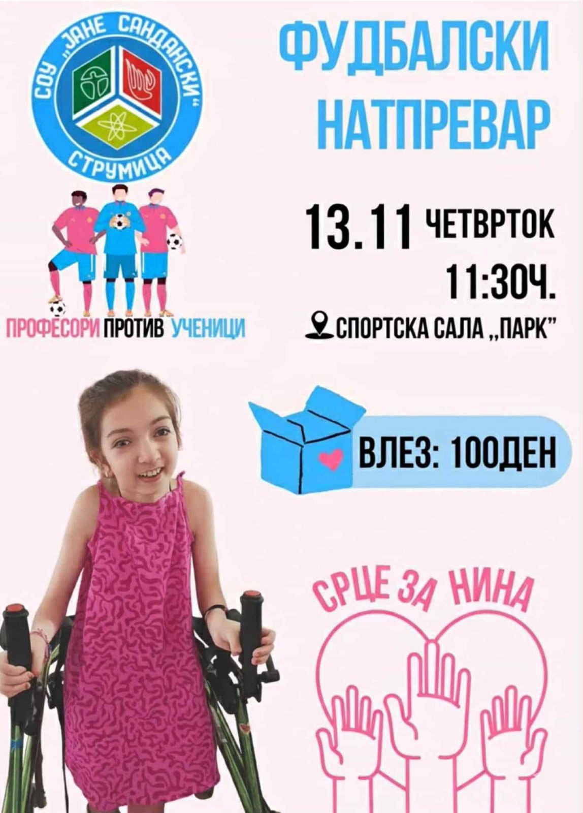 Во четврток, 13 ноември со почеток во 11:30 часот, во Спортската сала „Парк“ во Струмица, ќе се одржи хуманитарен фудбалски натпревар под мотото „Срце за Нина“, во организација на СОУ „Јане Сандански“од Струмица.