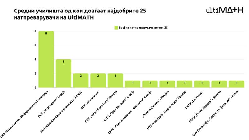 Според анализа на податоците од учесниците, топ 25 натпреварувачи доаѓаат од 12 училишта од Македонија. Од нив, осум учесници се од „Математичко-информатичката гимназија“-Скопје, четири учесници се од „Јахја Кемал“-Скопје, по два учесника од „Nova International School“-Скопје, „Алгоритам“-Скопје и „Јосип Броз-Тито“- Битола. Од улилиштата „Орце Николов“-Скопје, „Раде Јовчевски-Корчагин“-Скопје, ОСТУ „Гостивар“ „Ѓорѓи Наумов“-Битола, „Љупчо Сантов“-Кочани, „Мирче Ацев“-Прилеп и „Славчо Стојменски“-Штип имаа по еден учесник во топ 25 натпреварувачи.
