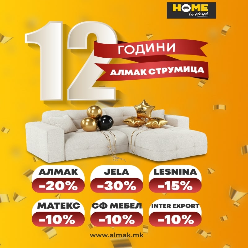 Овој месец Алмак слави 12 години успешна работа во Струмица – 12 години во кои заедно со вас градат топли и модерни домови, ја оживуваат вашата визија за уредување и веќе повеќе од една деценија се дел од вашиот секојдневен избор за мебел и ентериер. Од првиот ден па сè до денес, нивната цел беше едноставна: да понудат квалитет, удобност и дизајн кој инспирира.