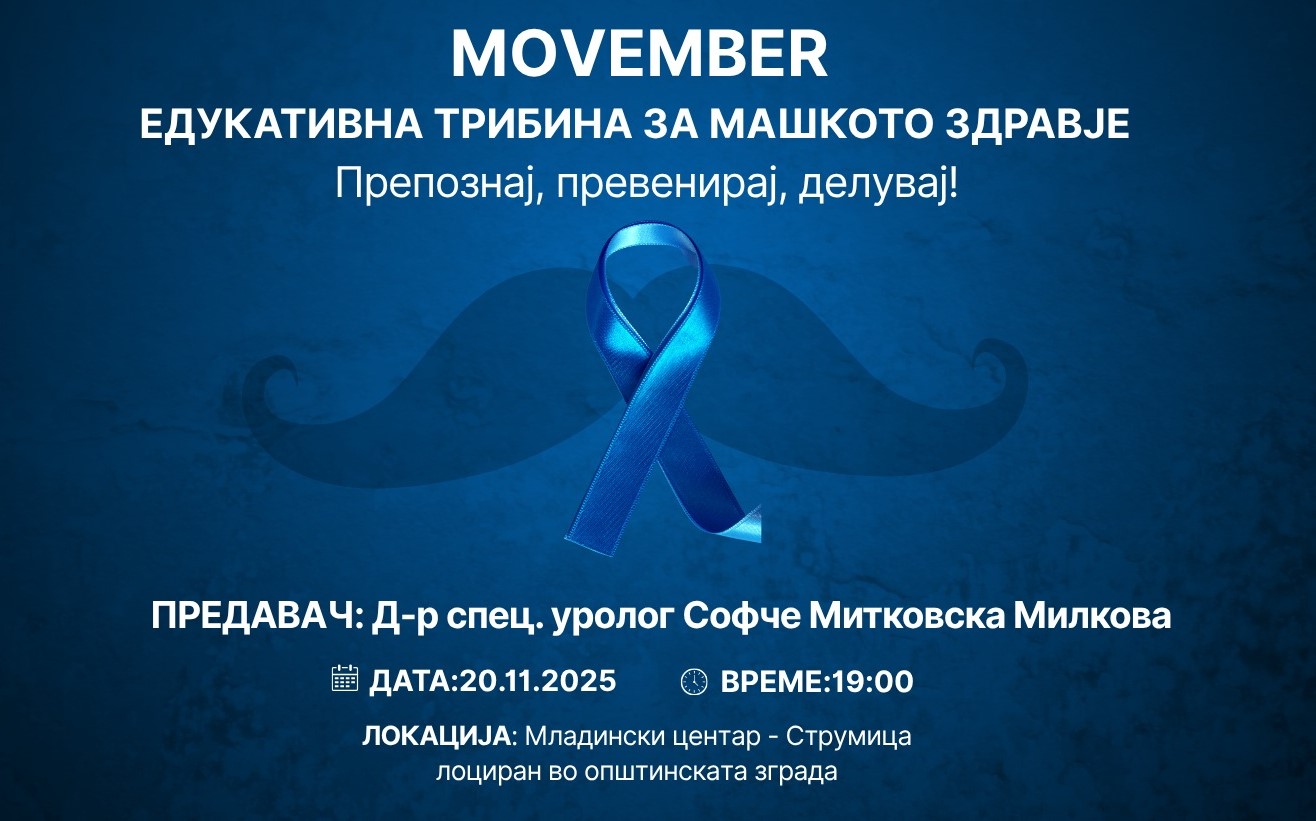 Ротари Клуб Струмица го најавува настанот „MOVEMBER – Едукативна трибина за машкото здравје“, кој ќе се одржи на 20 ноември 2025 година (четврток), со почеток во 19:00 часот, во Младинскиот центар – Струмица, лоциран во општинската зграда.