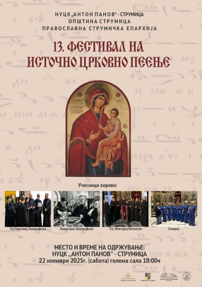И годинава, во организација на Центарот за култура „Антон Панов“, а во соработка и со поддршка од Општина Струмица и Православната Струмичка Епархија, ќе се одржи 13. издание на Фестивалот на Источно црковно пеење. Настанот е закажан за сабота, 22 ноември, со почеток во 18:00 часот, во големата сала на Центарот за култура во Струмица.